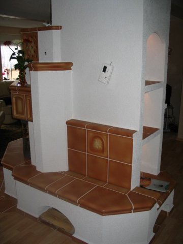 Kachelkamin freistehend mit beheizter Sitzbank/Anlehne (Wasser